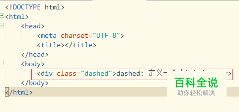 打开html开发工具,新建一个html代码页面,然后创建一个<div>标签,并给这个标签添加文字和一个class为了dashed。 创建<div>代码:<div class="dashed">dashed: 定义一个虚线边框</div>