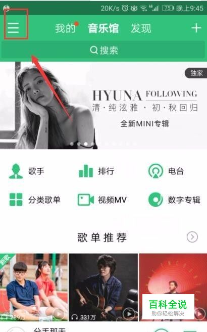 打开QQ音乐,来到了QQ界面,我们点击左边上方的三绿色条,如图所示。