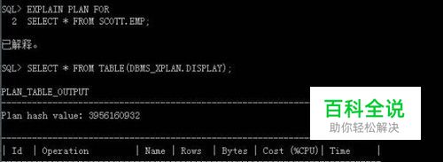 在SQL*PLUS,PL/SQL的命令窗口下执行下面步骤 : SQL>EXPLAIN PLAN FOR SELECT * FROM SCOTT.EMP; --要解析的SQL脚本 SQL>SELECT * FROM TABLE(DBMS_XPLAN.DISPLAY); 如图