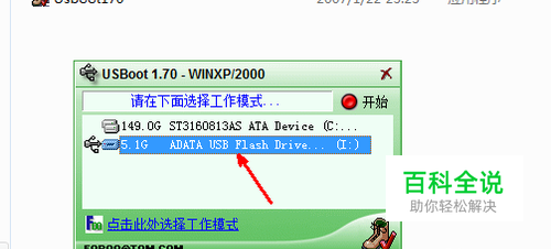 首先打开usboot,插上你的U盘,然后会在磁盘的列表中显示出你的电脑中的所有磁盘。如图,我们点击一下U盘。