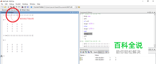 定义好之后,之间在命令窗口(command window)输入a+b即可,如图所示,输入完之后,按下回车键(enter),就可以显示结果。也可以选择输入 c=a+b,用c来代表矩阵方便后面的运算。
