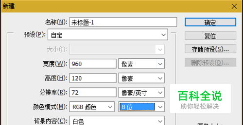 打开photoshop工具,选择新建。选择960*120的尺寸。选择好画布的属性。