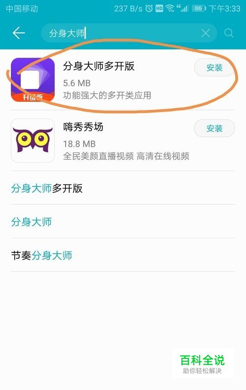 进入应用市场,在搜索框输入分身大师,选择分身大神多开版,下载并安装,如图示: