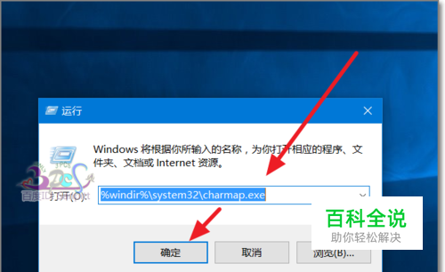在运行中输入%windir%\system32\charmap.exe点击确定,也可以在Windows的system32下找到charmap.exe