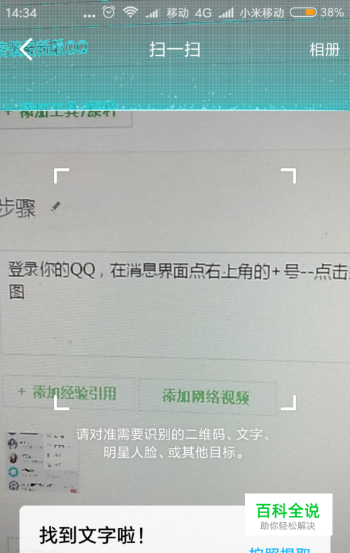如果你想扫描屏幕上的文字方法是相同的,下面我们来看看怎么扫手机内图片的文字。 打开qq扫一扫,找到界面右上角的【相册】,打开相册,选择你要识别的图片,点【确定】。软件会对图片的文字自动识别,其他方法同上。