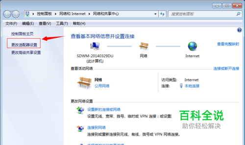 进入网络给共享中心你会看到,网络的连接状况,点击更改适配器设置,可以进入网络连接的界面。