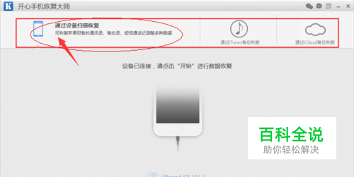 运行软件,软件提供三大恢复模式可以恢复苹果手机数据。本文选择“通过设备扫描恢复”方法,以此恢复模式为例,详细告诉大家苹果手机短信删除了怎么恢复。苹果手机通过数据线连接电脑,连接成功后,点击“开始”。(如苹果手机第一次连接电脑,需要在手机点击下“信任”)