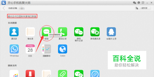 点击“开始”后,软件自行跳转到恢复数据的主界面。通过主界面我们可以看到,开心手机恢复大师支持恢复的数据共达17种之多:除了短信,微信聊天记录、备忘录、通讯录、照片等,那么苹果短信误删除了怎么恢复?我们点击“短信”图标。