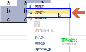 在选择的单元格上点击鼠标右键,再用鼠标左键点选弹出菜单中的“复制”。 (也可以直接按组合键“Ctrl+c”复制)