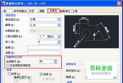 单击“主单位”选项卡,找到测量单位比例,在比例因子框中输入10,如图所示。