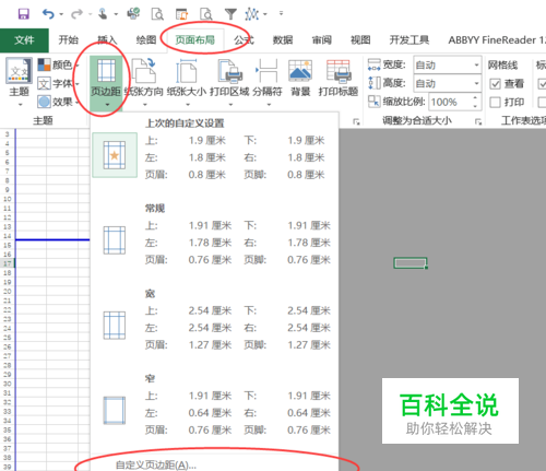第一步,打开表格,顶端表头栏目找到【页面布局】,然后【页边距】,然后【自定义页边距】; 如图所示: