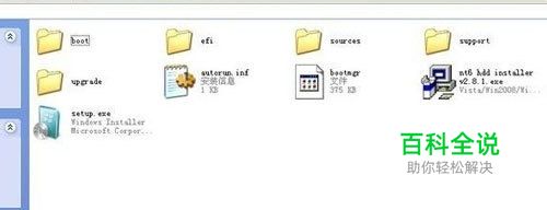 1、一般下载下来的都是ISO格式的镜像,所以将win7安装包解压出来后会有下图的文件。