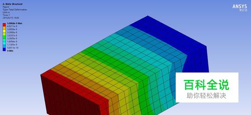 点击左侧的Solution,添加Deformation中的Total Deformation,点击Solve,即可得到计算结果。在结果中还有许多选择,包括应力、应变、沿某一个方向的位移等等,道理相同。