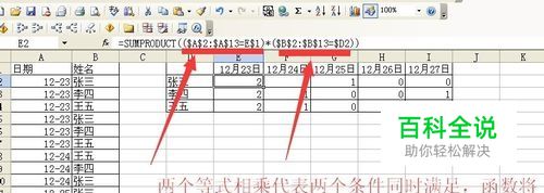 在红框区域的e2单元格输入函数,将返回这个人在对应日期出现的次数
