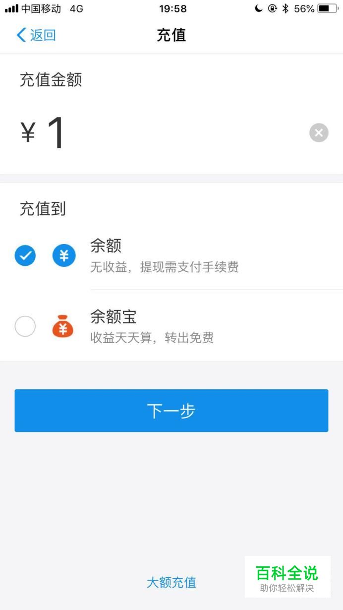 接着输入你要充值的金额并点击下一步,如下图所示。