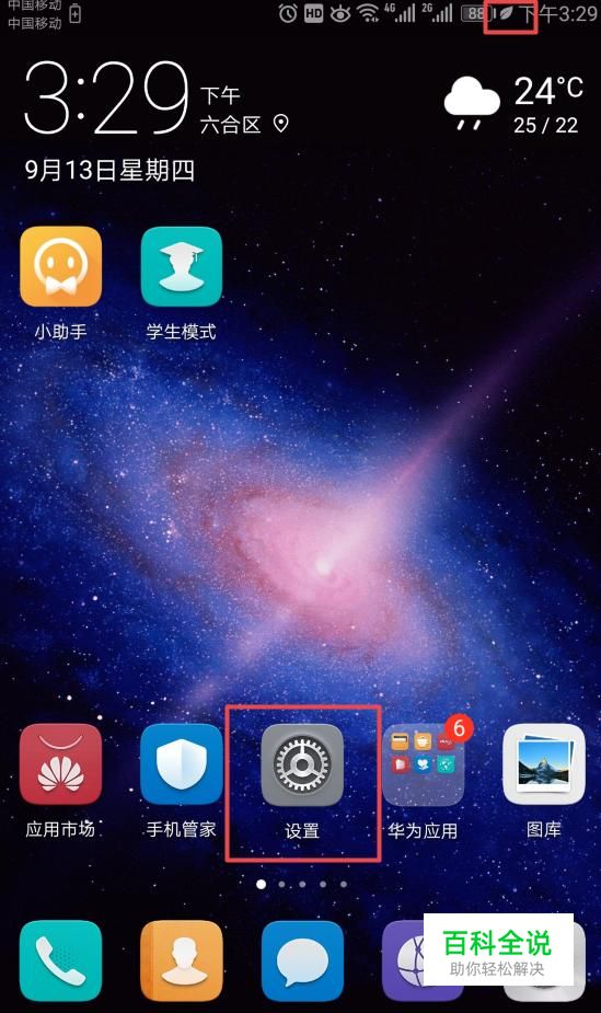 首先,我们打开我们的手机,我们可以看到在电池边上有一个小树叶子的图标,我们点击设置;