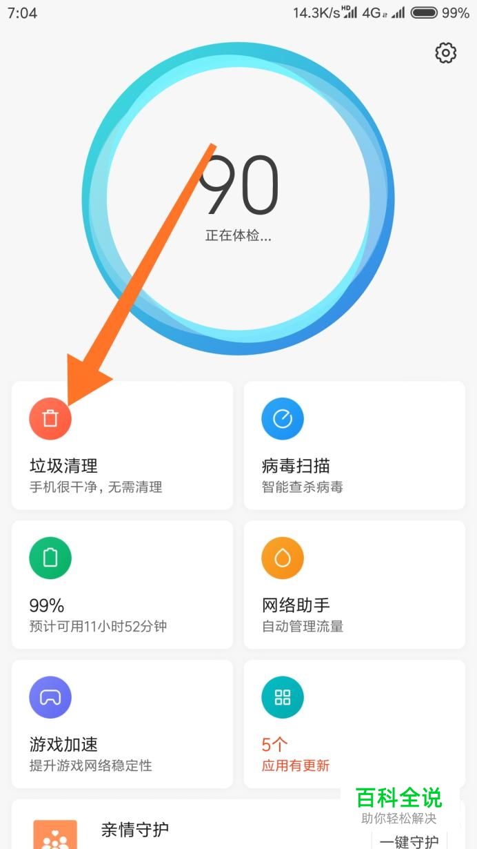 找到安全中心里面的“垃圾清理”,有时候显示的是已有垃圾文件大小。
