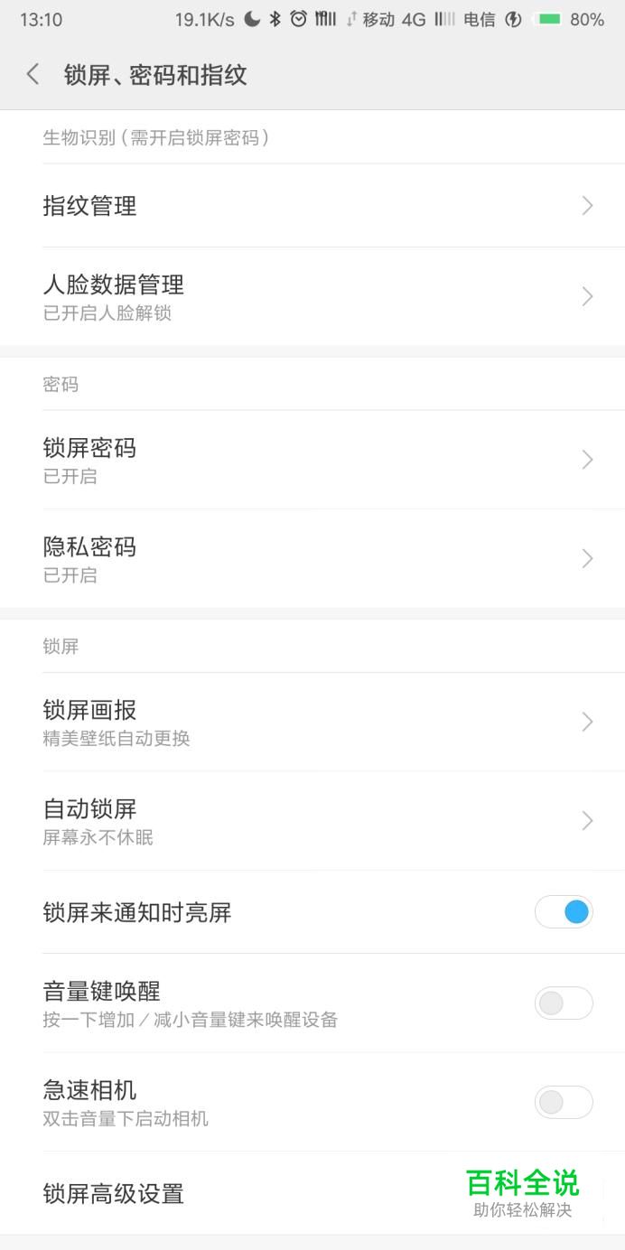 里面可以设置指纹、人脸识别、图案密码等,选择最后一项锁屏高级设置;