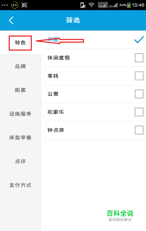 酒店类型:点击左下角的筛选按钮,切换到特色或者品牌一栏,选择你想预定的类型,当然,你可以在点评一栏中排除那些评分很低的酒店。