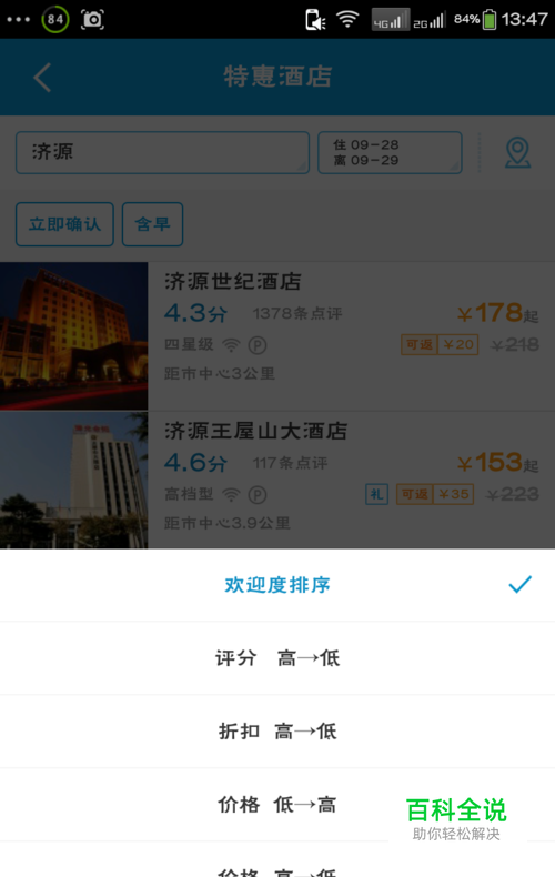 欢迎度排序:有三种排序方式:评分、价格、距离,你可以选择不同的排序方式,定位适合你的酒店