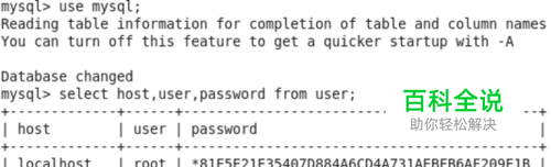 切换到mysql库,并查看user表,如图四所示 use mysql; select host,user,password from user;