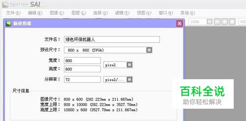 打开SAI软件后,鼠标左键在菜单【文件】>>【新建】单击,新建一个SAI文件,在新建的文件窗口上,可设置文件的大小,并重新命名,这里取名绿色环保机器人,如下图所示。