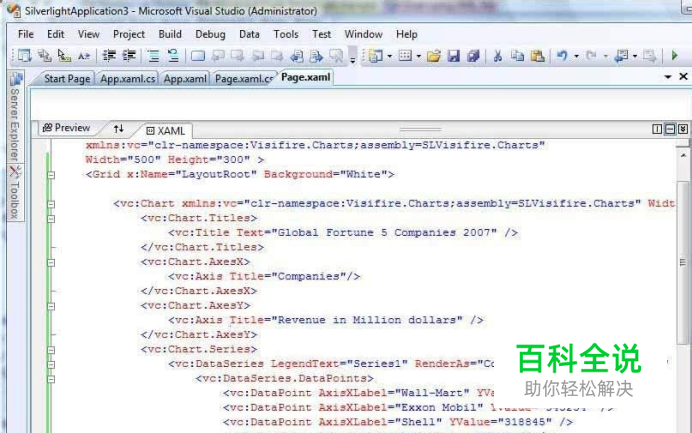 第1步:创建一个silverlight托管代码应用程序。 第2步:一旦在VS中创建了新的项目,找到Page.xaml文件,在"LayoutRoot" Grid 中编写一个 chart XAML,并在<UserControl>标签中将宽和高分别改为"500"和"300"。 蓝色部分为修改 Page.xaml部分。 注:vc是用于创建Visifire图表对象的命名空间。 <UserControl x:Class="SLVisifireApp.Page" xmlns="http://schemas.microsoft.com/winfx/2006/xaml/presentation" xmlns:x="http://schemas.microsoft.com/winfx/2006/xaml" xmlns:vc="clr-namespace:Visifire.Charts;assembly=SLVisifire.Charts" Width="500" Height="300"> <Grid x:Name="LayoutRoot" Background="White"> <vc:Chart xmlns:vc="clr-namespace:Visifire.Charts;assembly=SLVisifire.Charts" Width="500" Height="300" Theme="Theme1" > <vc:Chart.Titles> <vc:Title Text="Global Fortune 5 Companies 2007" /> </vc:Chart.Titles> <vc:Chart.AxesX> <vc:Axis Title="Companies" /> </vc:Chart.AxesX> <vc:Chart.AxesY> <vc:Axis Title="Revenue in Million dollars" /> </vc:Chart.AxesY> <vc:Chart.Series> <vc:DataSeries LegendText="Series1" RenderAs="Column" AxisYType="Primary" > <vc:DataSeries.DataPoints> <vc:DataPoint AxisXLabel="Wall-Mart" YValue="351139" /> <vc:DataPoint AxisXLabel="Exxon Mobil" YValue="345254" /> <vc:DataPoint AxisXLabel="Shell" YValue="318845" /> <vc:DataPoint AxisXLabel="BP" YValue="274316" /> <vc:DataPoint AxisXLabel="General Motors" YValue="207349" /> </vc:DataSeries.DataPoints> </vc:DataSeries> </vc:Chart.Series> </vc:Chart> </Grid> </UserControl> 在添加了Chart XAML后,Page.xaml的效果如图所示: 第3步: 在同一个应用程序域中创建一个自定义主题。 右键单击SilverlightApplication文件夹,选择Add > New Item,便会出现一个新的Add New Item 对话框,选择“Silverlight User Control”,将其命名为“MyTheme.xaml”,点击"Add",如图所示: 第4步: 在Project Explorer中展开MyTheme.xaml,将显示MyTheme.xaml.cs文件。因为我们不需要托管代码文件时,删除MyTheme.xaml.cs文件。 第5步: 一旦你点击“Add”按钮,便创建了MyTheme.xaml文件。删除XAML文件中的所有内容,以ResourceDictionary取代它。 <ResourceDictionary xmlns="http://schemas.microsoft.com/winfx/2006/xaml/presentation" xmlns:x="http://schemas.microsoft.com/winfx/2006/xaml" xmlns:vc="clr-namespace:Visifire.Charts;assembly=SLVisifire.Charts" > </ResourceDictionary> 第6步: 在ResourceDictionary 标签中为图表元素创建图表样式。利用下面的代码创建图表和DataSeries的样式。 <Style x:Key="Chart" TargetType="vc:Chart"> <Setter Property="Background" Value="Gray"/> <Setter Property="View3D" Value="True"/> <Setter Property="AnimationEnabled" Value="False"/> </Style> <Style x:Key="DataSeries" TargetType="vc:DataSeries"> <Setter Property="RadiusX" Value="5"/> <Setter Property="RadiusY" Value="5"/> <Setter Property="Color" Value="Orange"/> </Style> 第7步: 一旦创建主题文件,找到MyTheme.xaml属性,修改BuildAction to Content。 第8步: 将主题添加至Page.xaml,如下图红色边框部分: 第9步: 运行Silverlight应用程序,便可查看到visifire图表的自定义效果: