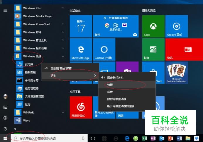 如图所示,展开"Windows 系统"文件夹。鼠标右击"此电脑"项,弹出快捷菜单点击"更多→管理"项。