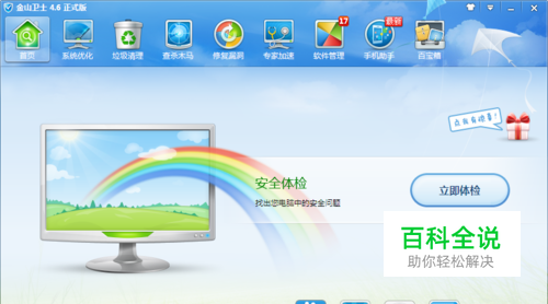 安装后,进入金山卫士,之后在该软件的最上端找到快捷按钮“百宝箱”,如下图: