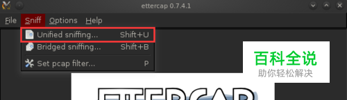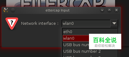 将手机与虚拟机连接相同的Wi-Fi,打开虚拟机中的BT5系统,连接上无线路由器,并打开一个终端,输入:ettercap -G。 选择图中的sniff下的unified sniffing…,选择网卡wlan0。