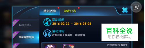 兑换方式:2月22日版本更新后,通过累积的60个娜可露露碎片即可免费换取英雄碎片收集:登录免费送活动时间:2月14日-2月15日 2月20日-2月22日活动规则:登录游戏即可获赠娜可露露碎片。