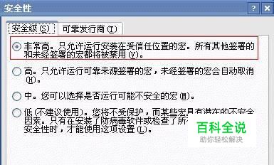 ②在弹出菜单中选择第一选项“非常高。只允许运行安装在受信任位置的宏。所有其他签署的和为经签署的宏都将被禁用。”;