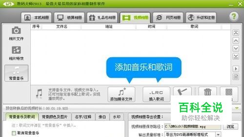 为视频相册配上音乐,让视频声色并茂 点击“添加媒体文件”按钮,可以导入音频文件或者视频文件,作为相册的背景音乐的。软件还可以为相册添加动感的LRC歌词字幕。