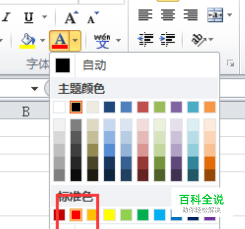选中输入信息的单元格,再依次点击标题菜单栏的“开始”选项,在开始选项菜单栏中选择字体颜色点击,在弹出的颜色选项框中点击【红色】选项。如图所示;