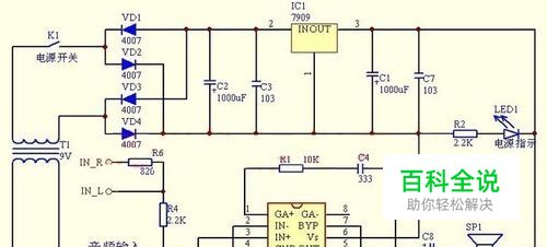原理介绍: 本制作套件电路原理如下图如示: 其中LM386为集成功率放大电路,市电经变压器降压,桥式整流、电容滤波后,形成一个直流电压,经三端稳压集成电路7909稳压后,输出稳定的9V直流电压,作为整机的工作电源。LED1为电源指示灯,当开关接通后灯便点亮。音频信号经音量电位器后,输入IC2的正相输入端,经内部放大后,从5脚输出被放大的音频信号,驱动扬声器发音。1脚所接为反馈电路,由于对低频部分的反馈较小,因此整个电路对低频部分具有较强的放大能力,达到电路设计之目的。