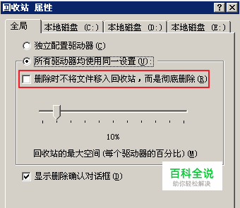 在执行删除操作一段时间后,回收站就会被塞满,我们可以对每一个磁盘进行单独设置回收站空间大小,勾选“独立配置驱动器”,这样就不容易出现提示空间不足的警告了。