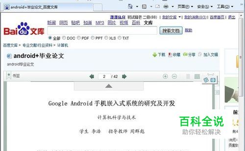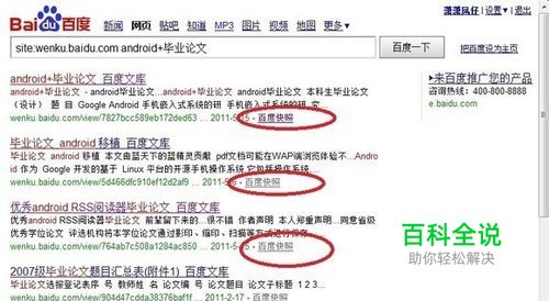 文章不能复制,题目总是可以的吧。我们把题目记住之后, 在搜索引擎的框框里输入:site:wenku.baidu.com +题目 【site命令是指在制定的网站里搜索,加号也是要的,如果嫌输入加号麻烦,可以用空格代替。】 如搜索android+论文,输入:site:wenku.baidu.com android+论文 (中间有空格) 搜索引擎都有网页网页快照,如百度有百度快照,谷歌有网页快照,我们点击快照进入网址.