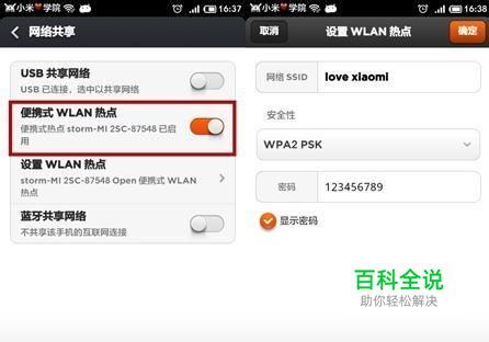 然后打开“便携式wlan热点”,这时通知栏会出现一个同似链接wifi的小标(右边),然后点“设置WLAN热点”输个热点名并设个密码,然后确认;