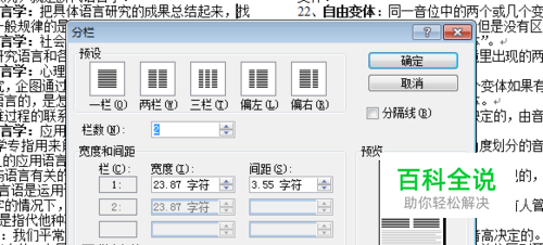 在出现的选项卡中选择要分的栏数,注意有几种不同的选项,根据自己的需要选择。如果要发多栏在栏数内添上要分的栏数,确定退出。