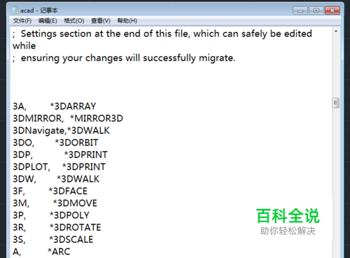下查到快捷键部分,前面字母为简写,后面为全写,修改时直接将前面的简写字母替换为自己想要的即可,注意不要与现有的重复,例如将复制的快捷键“CO”改为“CC”是不是更方便我们键盘输入呢。如果你不知道这些字母到底是代表哪个命令,可先用鼠标点击相应命令图标,在命令栏里会显示该命令的全写,然后反过来在该记事本里查询相应的简写,在其修改即可。