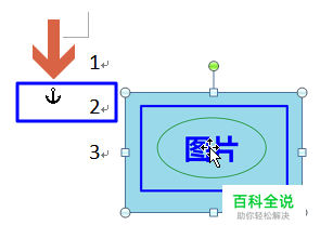 点击图片后,在图片旁出现了一个锚形标识。 “锚”一般会出现在图文混排中(文字环绕为非嵌入式),简单地讲,“锚”是用来定位其对应对象所处的段落位置的。如果“锚”所处的段落被移动,则“锚”对应的图片等对象也跟着移动。 例如,本例中图片的“锚”的位置在第二行。