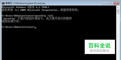 调出了命令行,如果需要查询IP地址,此时可以输入“ipconfig /all”,如下图所示,却告知ipconfig不是内部或外部命令,那么怎么办呢?