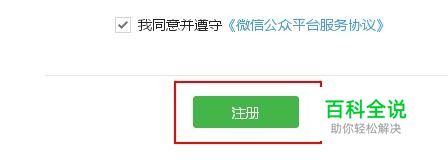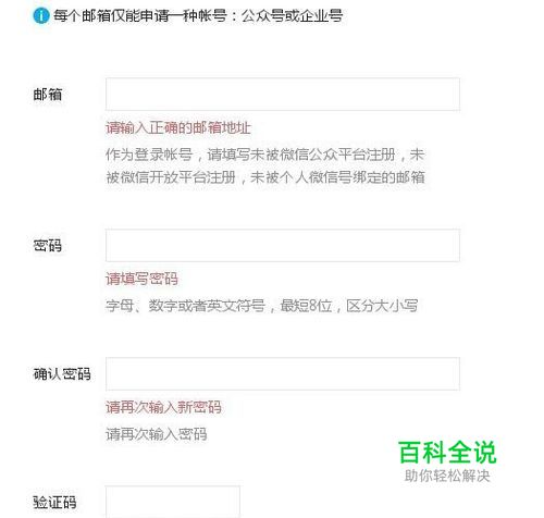 填写邮箱、密码、再次输入密码确认,并输入验证码,勾选“我同意并遵守《微信公众平台服务协议》”,单击“注册”。注意每个邮箱仅能申请一种账号:公众号或企业号。