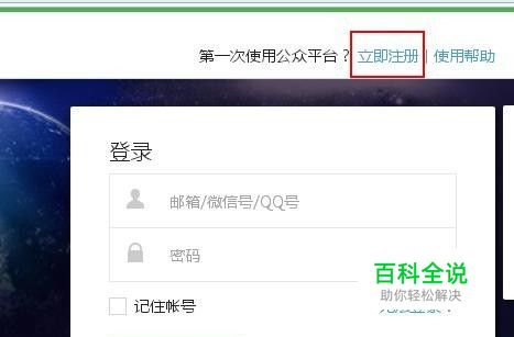 在登录界面上方会有提示:“第一次使用公众平台?”,点击右边的“立即注册”进入注册页面。