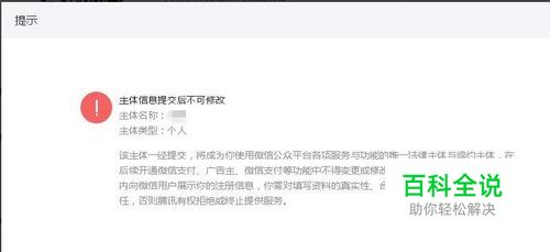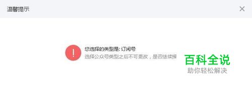 选择账号类型为“订阅号”,单击右下方的“选择并继续”。弹出提示“您选择的类型是:订阅号,选择公众号类型之后不可更改,是否继续操作?”,单击“确定”。