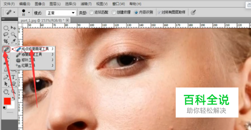 第二步,把图上的脸的部位进行修复,点击修补工具,选择污点修复,如图