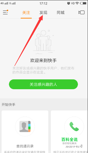 打开手机中的快手APP,之前如果登录过的话是自动登录的,进入后的页面是关注页面,选择点击上面的 发现。