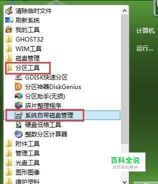 进入pe系统桌面,点击桌面左下角开始菜单,接着依次点击“分区工具”--“系统自带磁盘管理”,如图: