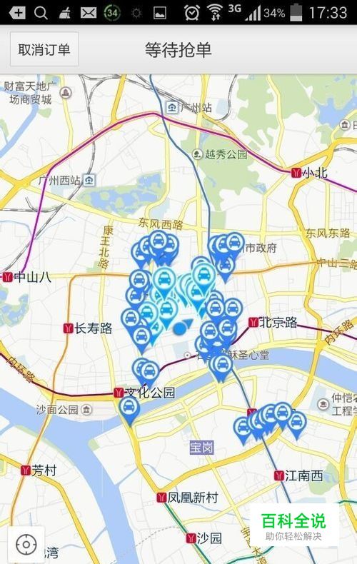 提交后来到打车页面,这时处于等待抢单状态,点击左上角取消订单