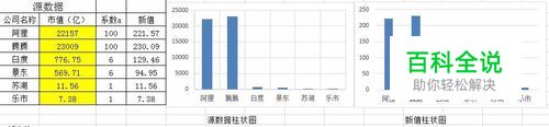 修改标注:选中柱状图,右键添加数据标签,双击某个标签,编辑,将数字修改为源数据的值,并依次完成对所有标签和坐标轴标签和修改。选中X轴坐标标注>右键-选择数据>选择系列2>水平(分类)轴标签-编辑>选择原数据中公司名称,得到新的X轴坐标标注。